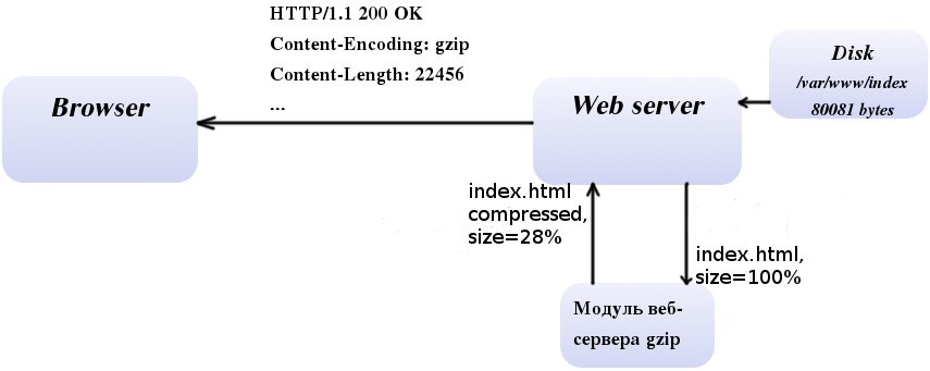 Отримавши запит, веб-сервер знаходить сторінку на диску, стискає її і надсилає відповідь (на схемі нижче розмір відповіді - 22кб замість вихідних 80кб). У свою чергу, браузер виконує зворотне перетворення - розіжме сторінку і покаже її користувачеві.